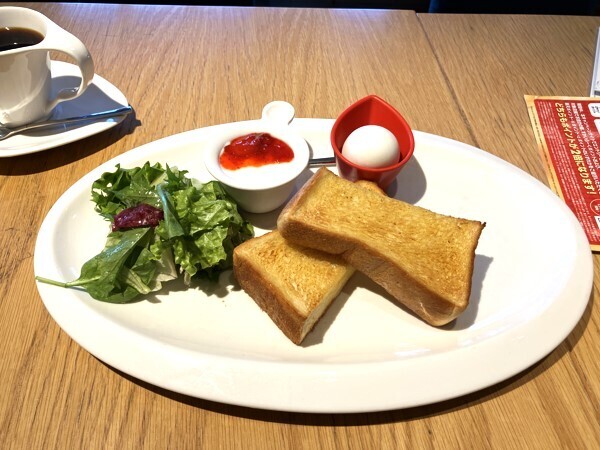 サラダのドレッシングもシンプル、トーストも適度な厚みと食べ応え、きれいな焼き目で文句なしのクオリティ。